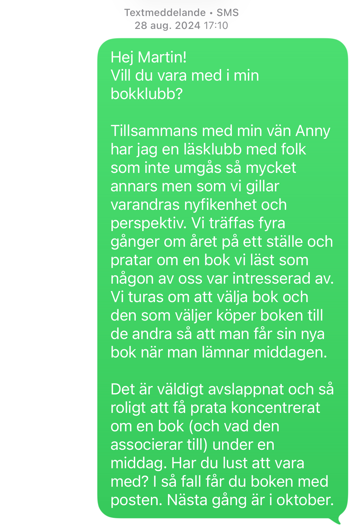 Vi är tio som inte umgås privat, utan känner till varandra av anledningar vi ofta glömt. En gång i kvartalet ses vi vid samma bord, på samma restaurang, och diskuterar boken livligt och hjärtligt, provar teorier och psykologiserar. Det är en pensionsexpert, en sexolog, en lärare, en forskare, en socialarbetare, bolags styrningsperson. Och hälften av dem har yrken som är okända för mig eftersom vi aldrig talar om det. Innehållet i boken ger upphov till diskussioner om livet, men vi pratar sällan om livet bortom boken.